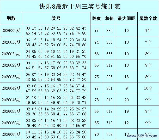 福彩快乐8第2026073期开奖回顾:02 03 06 08 09 20 26 27 29 35 52 57 64 67 73 74 75 76 79 80,其中奖号首尾间距为78,和值为862,最大间距为17,尾数分布为:尾数1包含0个号码,尾数8包含1个号码,尾数0、2、3、4、5包含2个号码,尾数6、7、9包含3个号码。