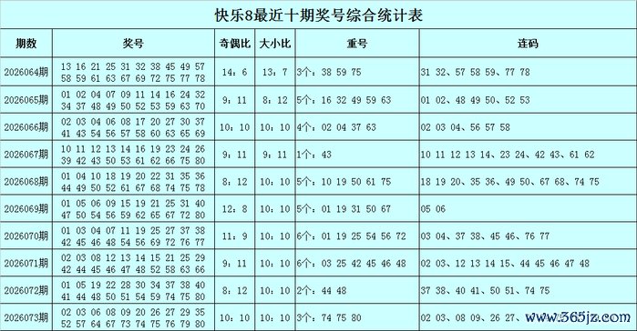 福彩快乐8第2026073期开出奖号:02 03 06 08 09 20 26 27 29 35 52 57 64 67 73 74 75 76 79 80,其中奖号奇偶比为10:10,大小比为10:10,包含3个重号74、75、80,包含连码02 03、08 09、26 27、73 74 75 76、79 80。